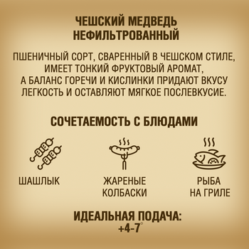 Светлое нефильтрованное пшеничное пиво, сваренный в чешских традициях пивоварения. Обладает мягким отлично сбалансированным вкусом. Чешский хмель в составе придает сорту приятный аромат