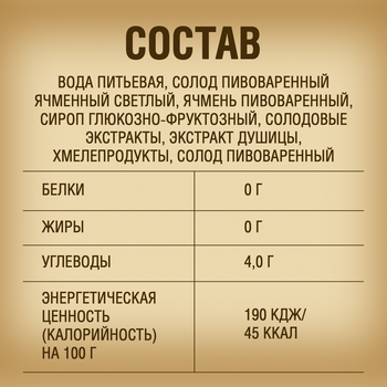 вода питьевая, солод пивоваренный ячменный светлый, ячмень пивоваренный, сироп глюкозно-фруктозный, солодовые экстракты, экстракт душицы, хмелепродукты, солод пивоваренный пшеничный