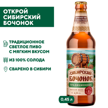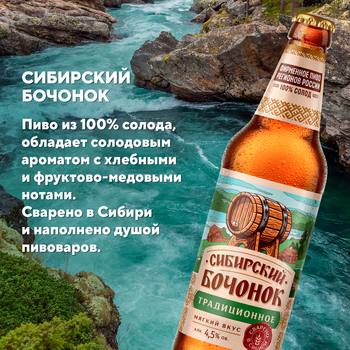 Традиционное светлое пиво с мягкой сладостью во вкусе, свойственной сибирскому пиву. Сварено из 100% солода и наполнено душой пивоваров