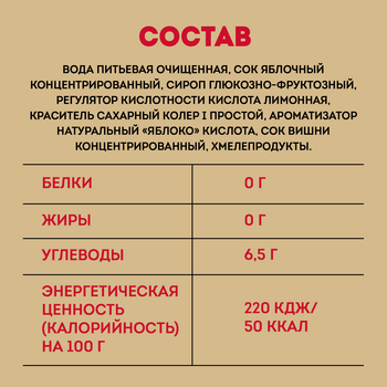 вода питьевая очищенная, сок яблочный концентрированный, сироп глюкозно-фруктозный, регулятор кислотности кислота лимонная, краситель сахарный колер I простой, ароматизатор натуральный «Яблоко»